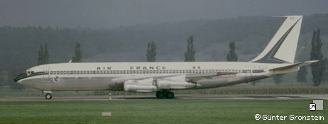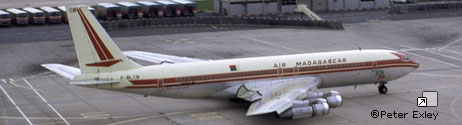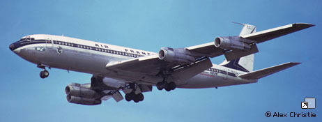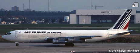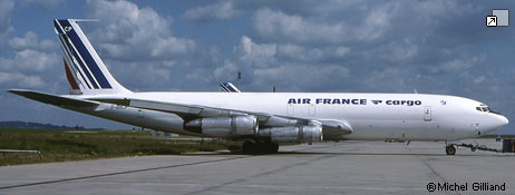 Frêtement AIR AFRIQUE, AIR MADAGASCAR, MEA, SAFA. Accidenté à Majunga (Madagascar) le 25 octobre 1964. A 45 cm après l'entrée de piste, le vol AF 464, trains rentrés, prend contact avec la piste et parcourt 1500 mètres en glissant sur le fuselage et les GTR N° 2 et 3 (JT4A11) prennent feu. 10 membres d'équipage et 70 Passagers sont saufs. Réparation sur place par BOEING. Remis en service le 23 décembre 1964. Réformé le 3 juin 1977. Dernier propriétaire connu : Air France . Ferraillé à Orly. |